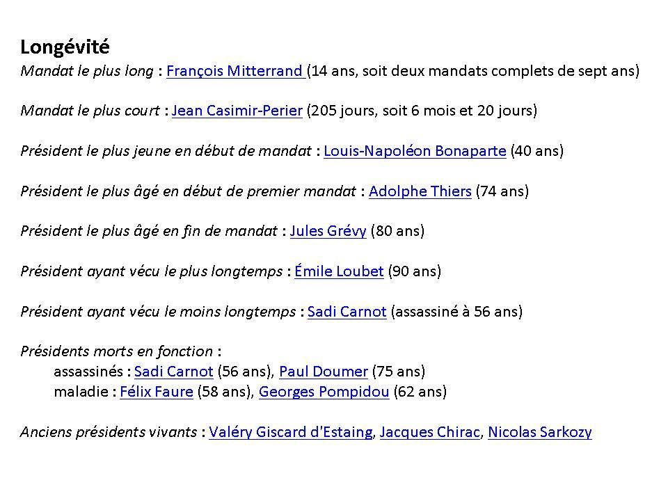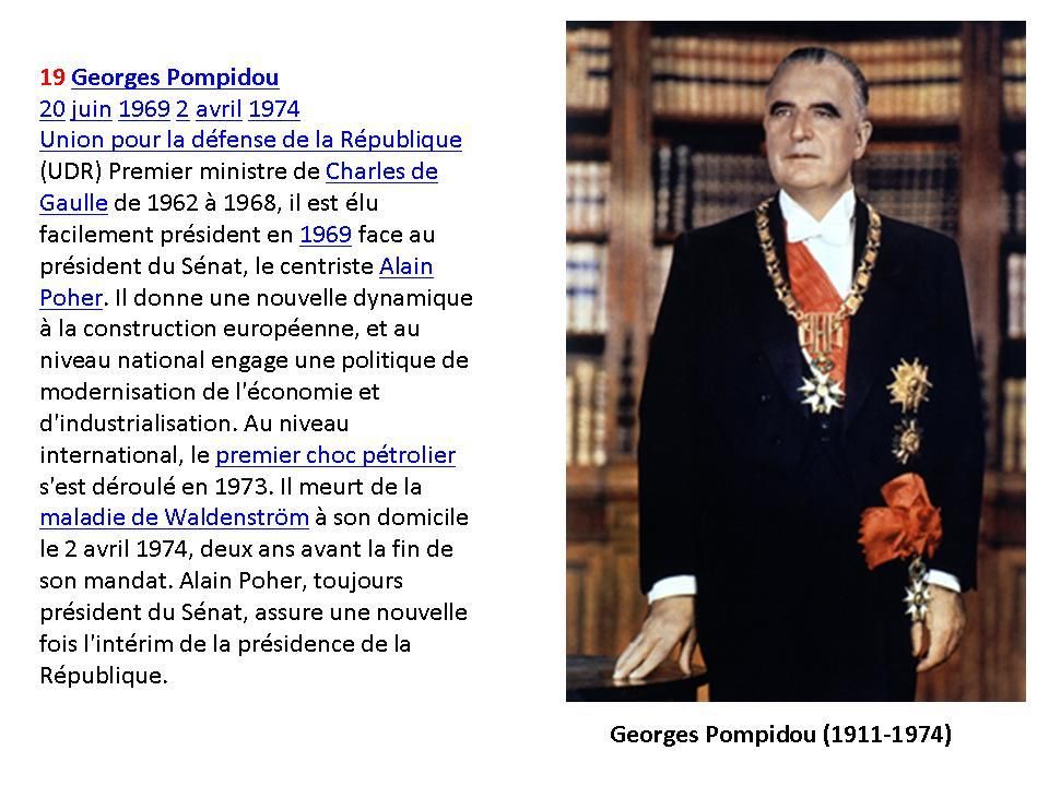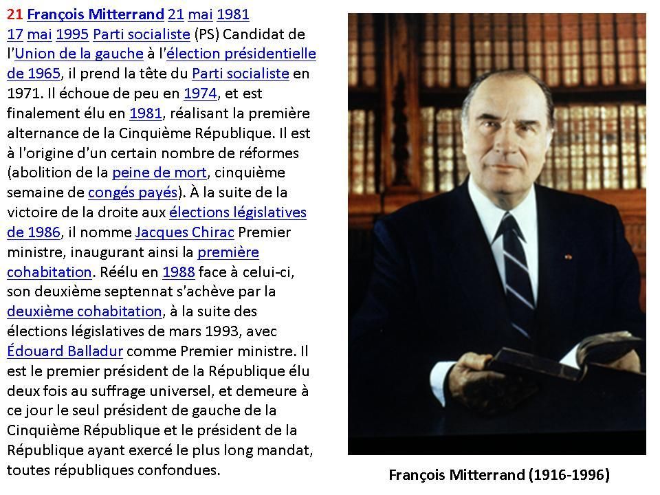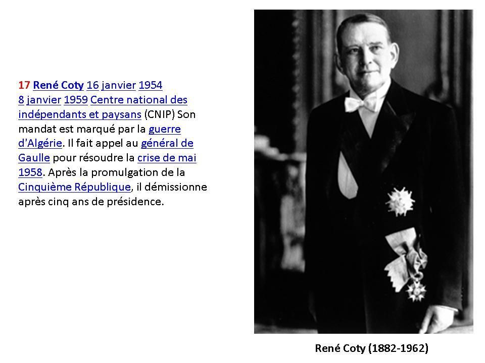 Mes souvenirs remontent à René Coty, avant lui, bien sur j'en ai entendu parlé par mes parents et mes grands parents, mais je n'en ai pas de souvenirs personnels j'était trop jeune pour certains et pas née pour d'autres.<br /> Tu as fait un beau travail de recherche, j'enregistre ton billet pour mon mari car je suis sure qu'il va aimer.<br /> Passe une belle journée<br /> Je t'embrasse.<br /> Maryse